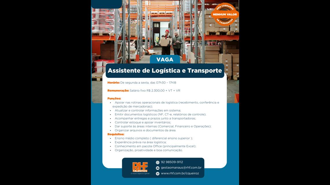 Oportunidade: Estamos buscando um profissional para a posição de Assistente de Logística e Transporte, para atender nosso cliente.
